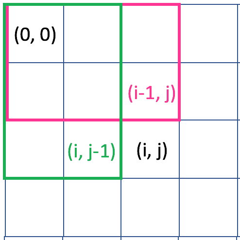 위의 그림과 같이 dp[i][j] 는 분홍색 네모와 초록색 네모를 합한 값에서 두 네모가 겹쳐진 dp[i-1][j-1] 을 빼주고 (i, j)의 위치에 있는 값을 더해주면 된다.