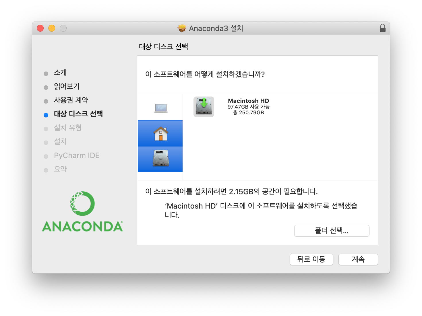그다음에 설치할 디스크를 선택하는데 특정 디스크를 선택해서 설치한다. 따로 폴더 선택을 해주지 않으면 /opt/anaconda3 경로로 설치된다. 이어서 '계속'을 눌러주면 설치가 끝나는데 시간은 조금 걸린다.